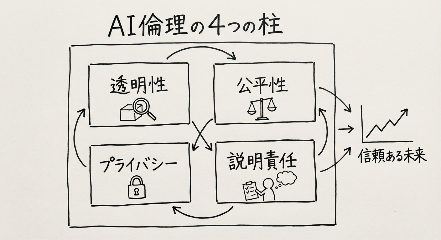 図1: AI倫理の基本原則。透明性、公平性、プライバシー、説明責任の4つが重要