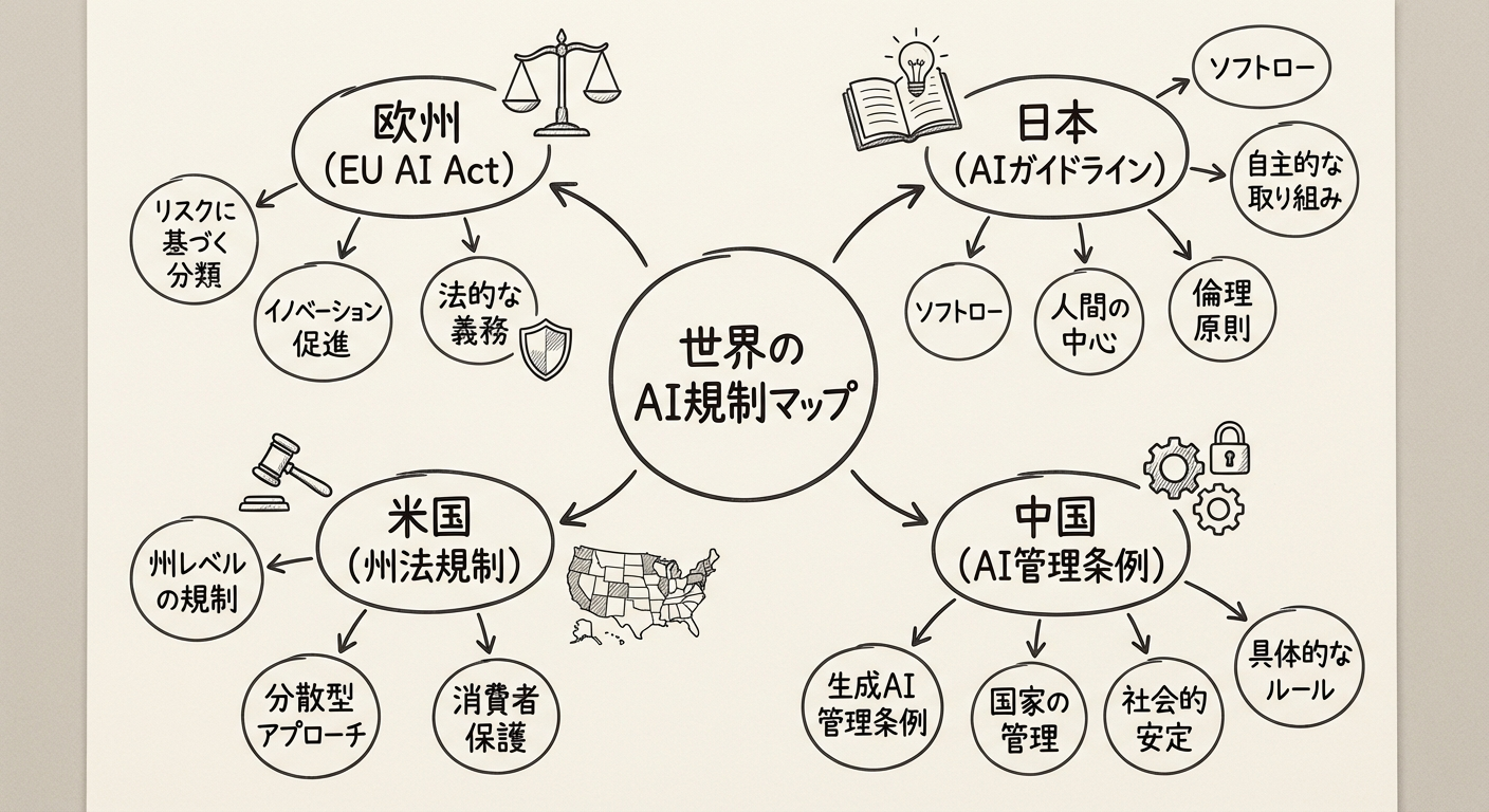 図2: 世界のAI規制マップ。EU AI Act、日本のAIガイドライン、米国の動向を示す