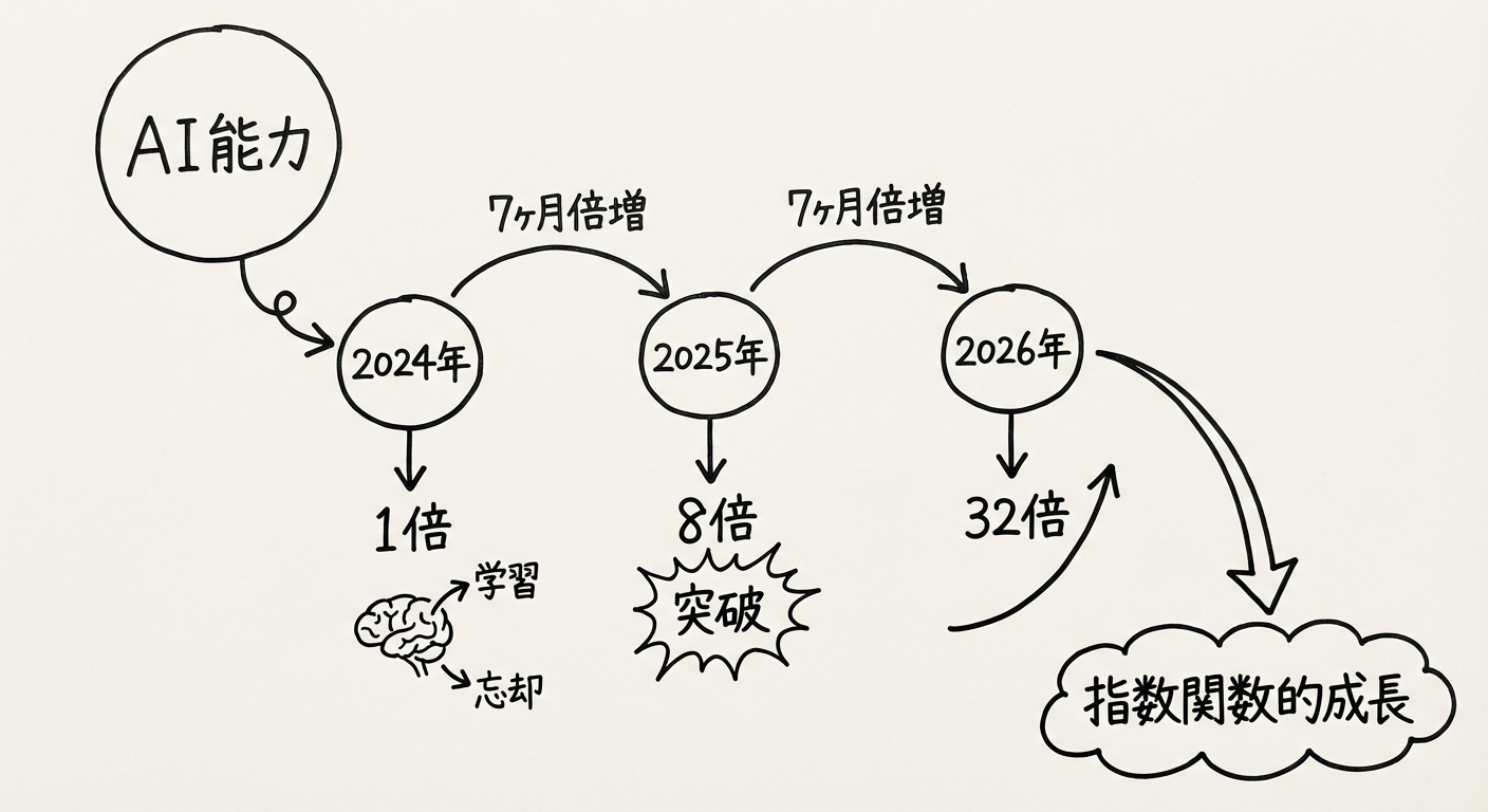 「AIの能力は、約7ヶ月ごとに倍増している。この指数関数的成長が続けば、2026年には人間の知性が経済生産において無関係になり始める」