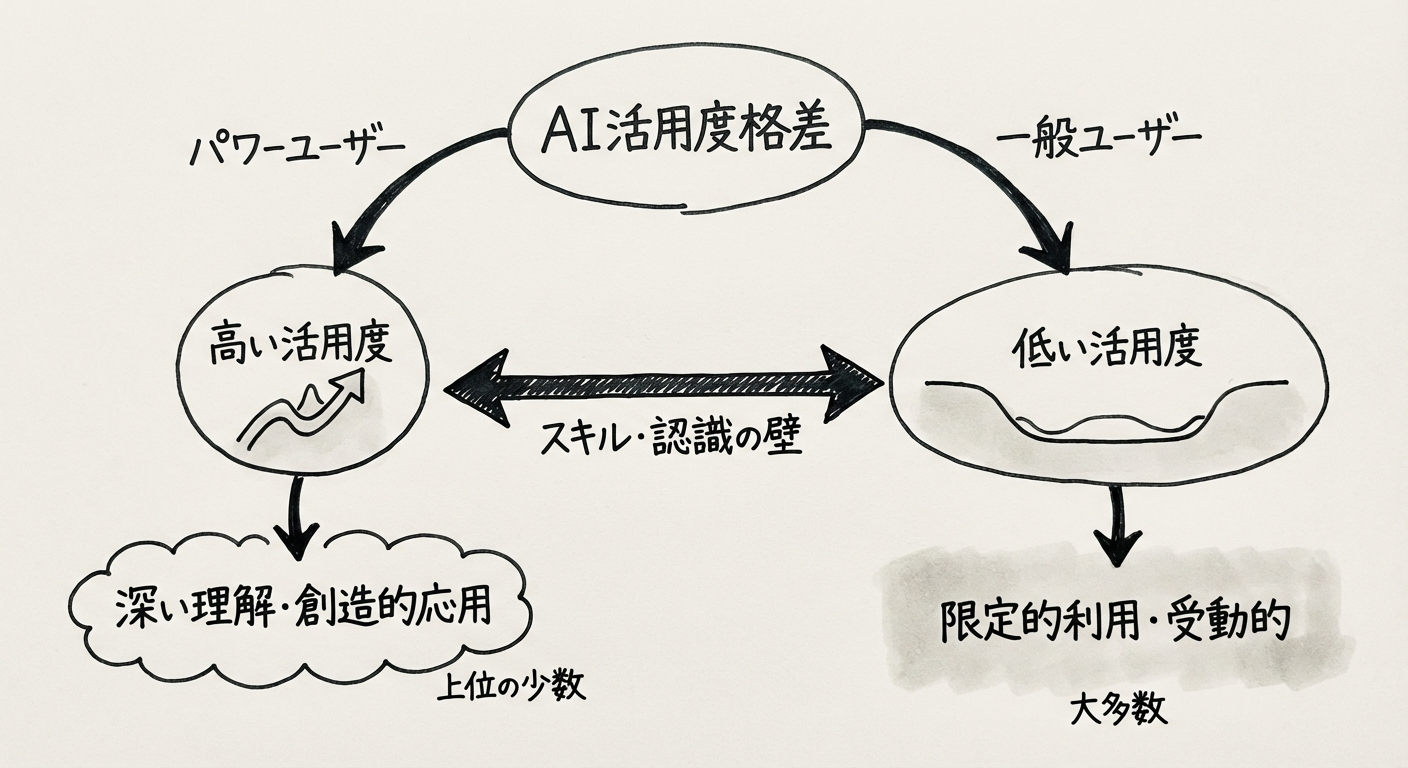 これらの数字は、同じツールへのアクセス権を持っていても、使いこなすリテラシーの有無で得られる恩恵に決定的な格差が生まれていることを示しています。
