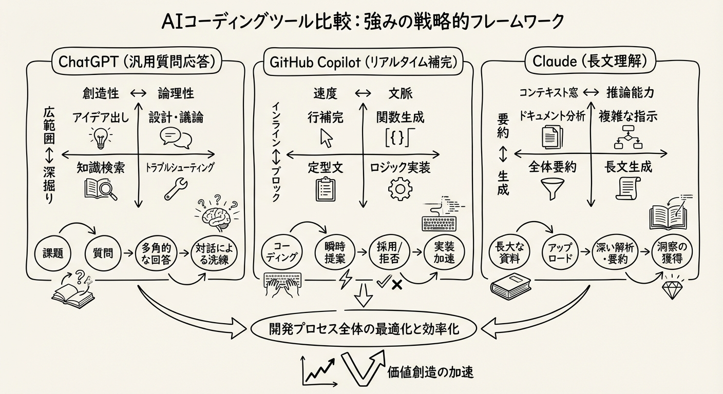 図2: 主要AIコーディングツールの比較。ChatGPT、GitHub Copilot、Claudeそれぞれの強み