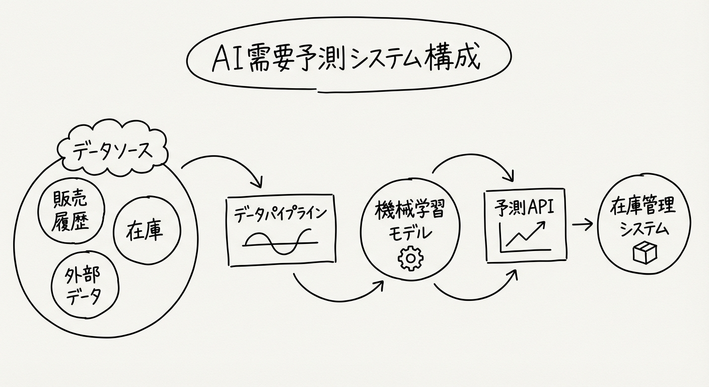 図1: AI需要予測システムの全体構成。データソースからデータパイプライン、機械学習モデル、予測API、在庫管理システムへのフロー