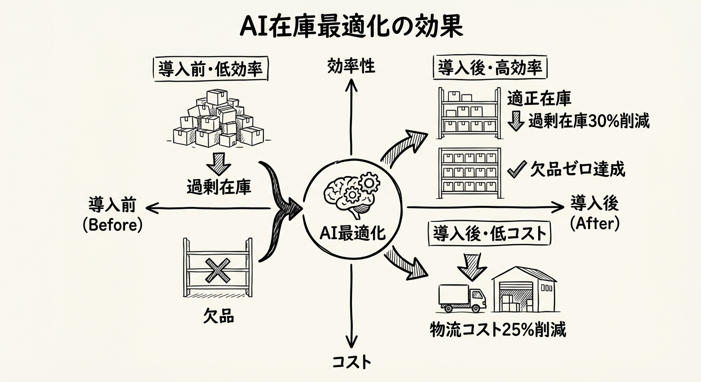 図2: AI導入による在庫最適化効果。過剰在庫30%削減、欠品ゼロ、コスト25%削減を達成